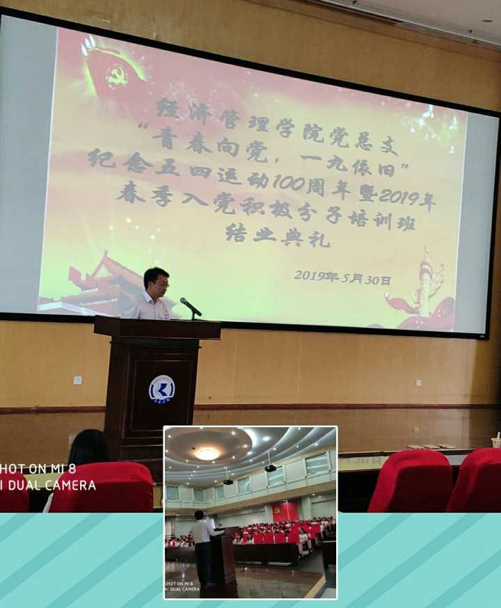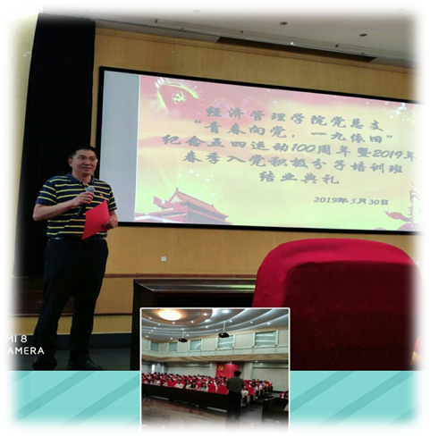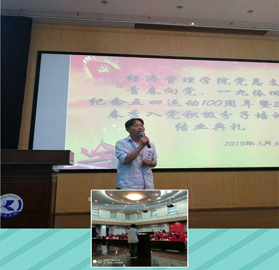 李雄老师的发言正式揭开了结业典礼的序幕,他首先对入党积极分子培训班顺利结业表示了祝贺,接着他对“五四运动”一百周年的历史进行了回顾。之后李雄老师结合党中央即将部署的“不忘初心、牢记使命”主题教育,强调同学们要坚持自己的初心——自己的梦想和善良,牢记自己的初心,同党中央的要求和国家的发展结合起来,砥砺前行。最后,他希望同学们积极向党组织靠拢,并对同学们提出了勤于学习,善于思考;对标榜样,争做榜样;牢记使命,继续前行等希望。