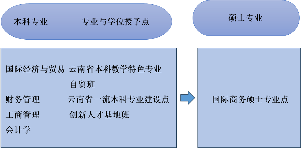 公司现有国际经济与贸易、财务管理、工商管理、会计学四个本科专业。2019年财务管理专业被列为云南省首批一流本科建设专业,国际经济与贸易专业被列为云南省本科教学特色专业以及云南省专业群改革建设试点专业。自2019年起承担2026世界杯官网创新人才(理科)基地班的人才培养工作,2020年,以四个本科专业为基础申请获批国际商务专业硕士学位点,并于2021年开始招生。2022年在国际经济与贸易专业分设自贸公司本科教学班——自贸班。截止2024年5月公司共有在校生1432人,其中研究生64人,职工70余名,形成了“本-硕”和职工教育多层次的人才培养体系。